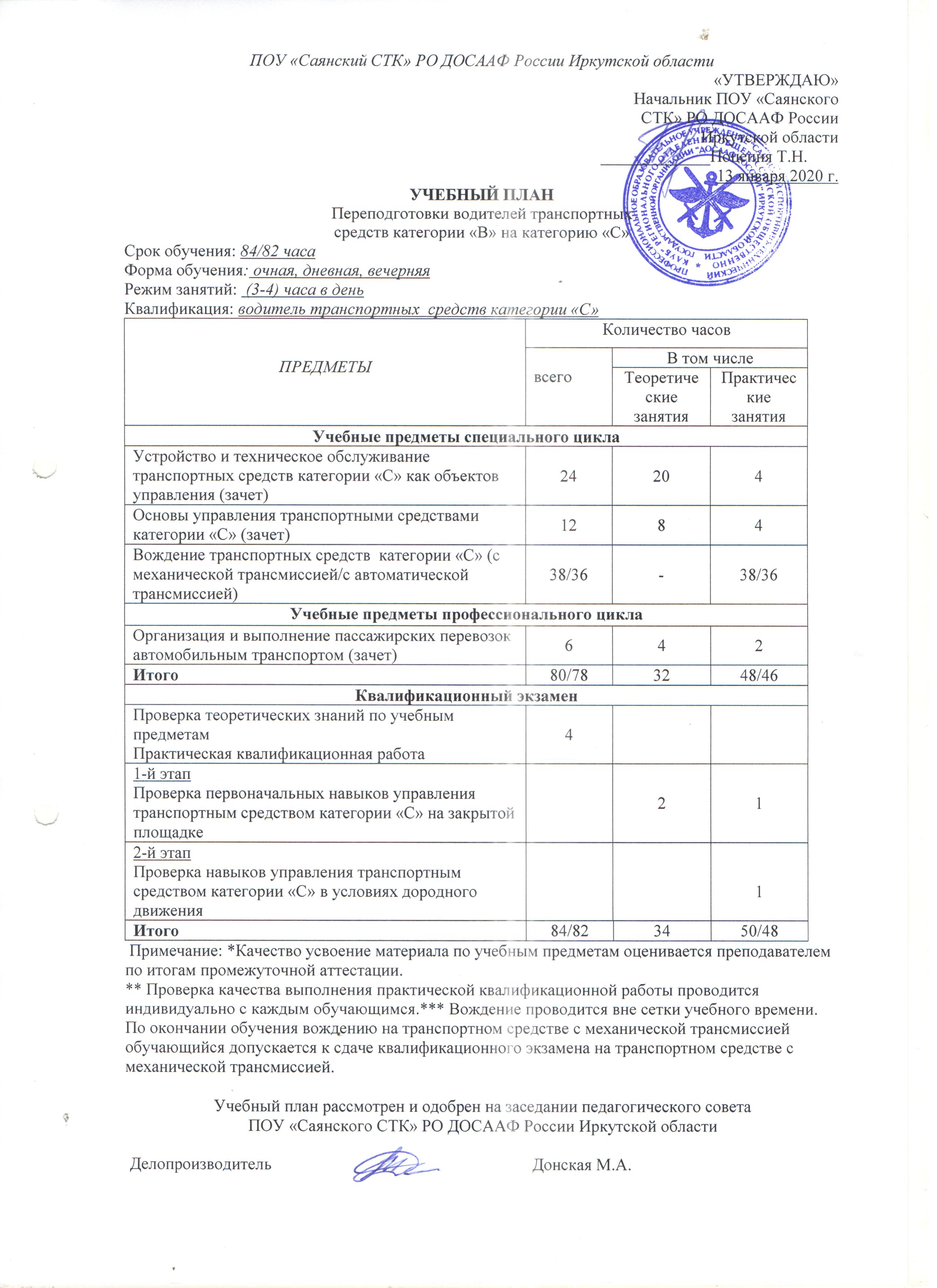 ПОУ «Саянский СТК» РО ДОСААФ России Иркутской области обучает водителей транспортных средств категорий «А», «В», «С» и осуществляет подготовку специалистов для Вооружённых Сил Российской Федерации, по следующим направлениям: водитель транспортных средств категории «С» ВУС-837 - обучение бесплатное (за счёт средств бюджета).